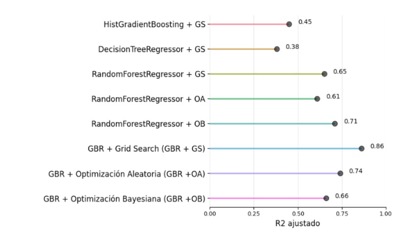 Se trabajó entonces con ingeniería de atributos y esto condujo al descubrimiento de asociaciones interesantes entre la glucemia y otras variables disponibles en la base que en general permite descubrir patrones de asociación no necesariamente elementales o lineales. Sin embargo, estos descubrimientos interesantes para el campo de la salud no se tradujeron en mejoras significativas en relación con la precisión de las predicciones. Para optimizar los hiperparámetros de los modelos se utilizaron diferentes algoritmos evaluando secuencialmente la mejora que cada uno de ellos aporta sobre el objetivo de predicción. En algunos casos el aporte de estas estrategias de optimización de los modelos no condujo a mejoras significativas en ninguno de los criterios presentados para la evaluación del desempeño de los modelos. Los resultados alcanzados, sin embargo, lograron mejoras altamente significativas respecto de los modelos propuestos inicialmente. Considerando la métrica del coeficiente de determinación ajustado para el modelo de regresión basado en las variables de laboratorio se logró alcanzar un valor del 0.75 seleccionando el algoritmo CATBOOST Regressor mientras que en el caso de la base de Findrisc mediante el Gradient Boosting Regressor se alcanzó un valor de 0.86 para el coeficiente de determinación ajustado. Cabe destacar que en ambos casos la optimización de hiperparámetros se realizó mediante una búsqueda de grilla o Grid Search. Estos resultados resultan alentadores en este campo del conocimiento porque además de tener un alto poder predictivo se convierten en una herramienta valiosa para estimar el valor de la glucemia en los pacientes.