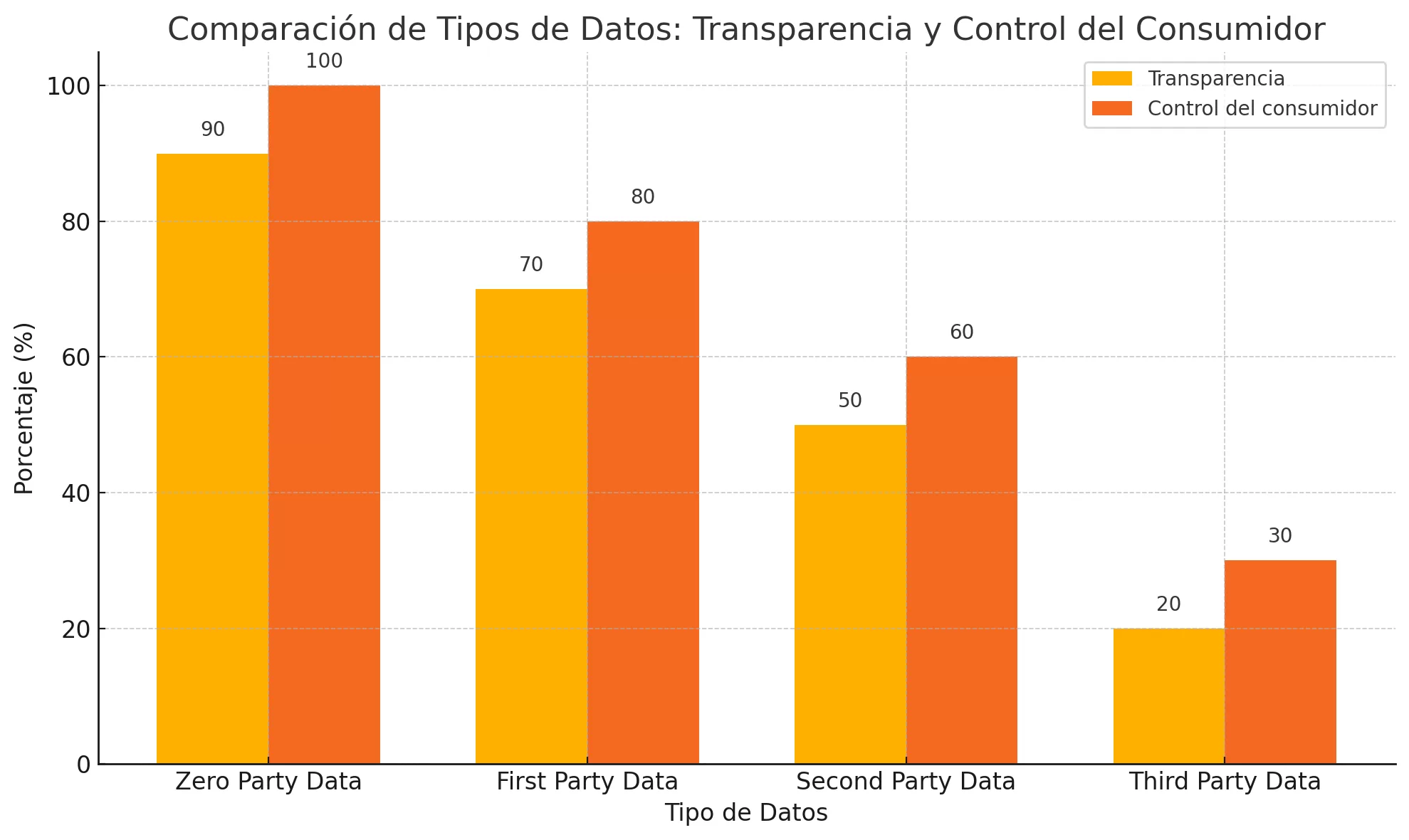 El Zero Party Data se refiere a la información que los consumidores comparten de manera voluntaria con las marcas. A diferencia de los datos de terceros (Third Party Data), el Zero Party Data se basa en la transparencia y el consentimiento explícito, permitiendo a las empresas captar las preferencias, intenciones y deseos de sus clientes de forma directa. Esto incluye datos como intereses, preferencias de compra o información sobre el contexto personal, que el consumidor decide proporcionar.